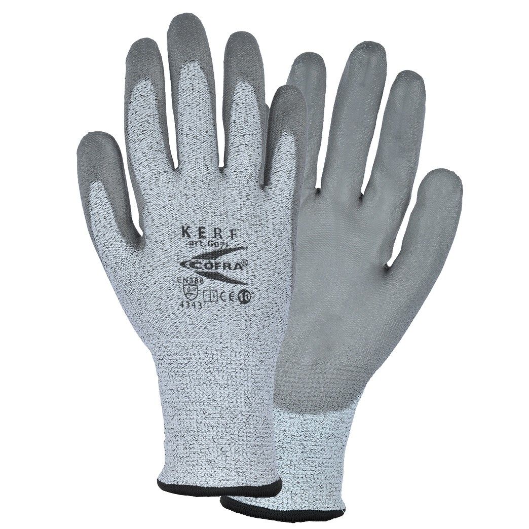 Guanti COFRA Kerf G071. Ottimo guanto con fodera in polietilene ad alta densità (HDPE) e nylon per un'ottima destrezza nell'utilizzo e una buona resistenza al taglio. Ideale per usi nell'industria del vetro, maneggio di lamiere, edilizia, industria meccanica e servizi ambientali.