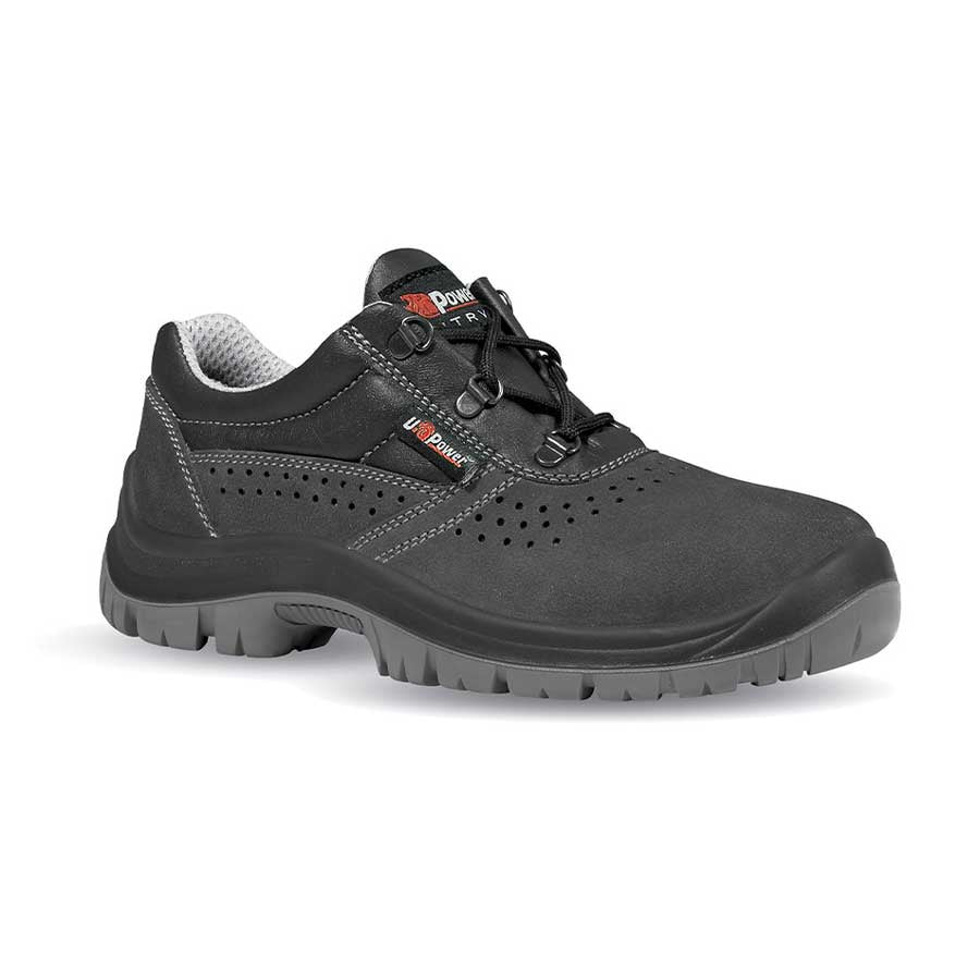 - Scarpe antinfortunistiche basse sicure della linea Entry U Power, con tomaia in pelle scamosciata forata, puntale in acciaio, antiperforazione, antiscivolo, lamina in acciaio ergonomica e suola PU/PU, S3 SRC